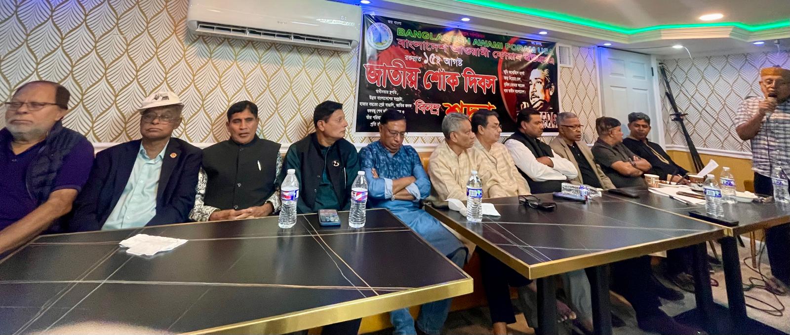 হাকিকুল ইসলাম খোকন, বাপসনিউজঃ গত সোমবার,১৮ আগস্ট ২০২৫,সন্ধ্যা সাড়ে ৭টায় নিউইয়র্কের এষ্টোরিয়ার হ্যালো বাংলাদেশ রেষ্টুরেন্টে বাংলাদেশ আওয়ামী ফোরাম ইউএসএ কর্তৃক আয়োজিত জাতীয় শোক দিবস যথাযথ মর্যাদায় পালন করা হয়।খবর আইবিএননিউজ।উক্ত আলোচনা সভায় সভাপতিত্ব করেন বাংলাদেশ আওয়ামী ফোরাম ইউএসএ সভাপতি আবুল বাশার মিলন ও পরিচালনা করেন সাধারণ সম্পাদক মাহমুদুল হাসান।আলোচনা সভায় প্রধান অতিথি ছিলেন যুক্তরাষ্ট্র আওয়ামী লীগের অন্যতম উপদেষ্টা,১৯৭২ সালের প্রথম বাকসু ছাত্র সংসদের জিএস ও বীর মুক্তিযোদ্ধা ড.প্রদিপ রজ্ঞন কর ।বিশেষ অতিথি ছিলেন যুক্তরাষ্ট্র আওয়ামী লীগ ও বাংলাদেশ আওয়ামী ফোরাম ইউএসএ’র অন্যতম উপদেষ্টা সিনিয়র সাংবাদিক হাকিকুল ইসলাম খোকন,বাংলাদেশ ফেডারেল সাংবাদিক ইউনিয়নের সাবেক মহাসচিব এ দিল্লিতে নিযুক্ত বাংলাদেশ দূতাবাসের সাবেক প্রেস মিনিস্টার সাংবাদিক সাবান মাহমুদ,যুক্তরাষ্ট্র আওয়ামী লীগের সাংগঠনিক সম্পাদক আবুল হাসিব মামুন,দফতর সম্পাদক প্রকৌশলী মোহাম্মদ আলী সিদ্দিকী,বীর মুক্তিযোদ্ধা শওকত আকবর চিচি,বীর মুক্তিযোদ্ধা ফারুক হোসাইন,বীর মুক্তিযোদ্ধা এবিএম জাকির হোসেন হিরু ভূঁইয়া,বাংলাদেশ আওয়ামী ফোরাম ইউএসএ”র উপদেষ্টা হারুন অর রশিদ, বাংলাদেশ আওয়ামী ফোরাম ইউএসএ”র উপদেষ্টা ও আওয়ামী লীগ নেতা মোঃআকতার হোসেন,শেখ হাসিনা মন্ত্রের সাধারণ সম্পাদক ও আওয়ামী লীগ নেতা কায়কোবাদ খান এবং মতিউর রহমান ফুলু ।বক্তব্য রাখেন জাতীয় শোক দিবস উদযাপন কমিটির আহ্বায়ক ও বাংলাদেশ আওয়ামী ফোরাম ইউএসএ উপদেষ্টা টি. মোল্লাহ,সদস্য সচিব আবুল এইচ হাবিব,আজহার ইসহাক খোকা,আমিনুল ইসলাম খান,মনিরুল ইসলাম,এমএ জিন্নাত,শহিদুল ইসলাম,নিলুফার ইয়াসমীন,(সংশোধন সদস্য সচিব আবুল এইচ হাবিব,সহ সভাপতি ফারুক হোসাইন ,মতিউর রহমান, মোঃ মোস্তফা,সহ সভাপতি সফিকুল ইসলাম, কবির হোসাইন ,শেখ শাহিন- জিয়াউল হক বিপ্লব- সাইফুল ইসলাম - আসাদ সুমন প্রমুখ